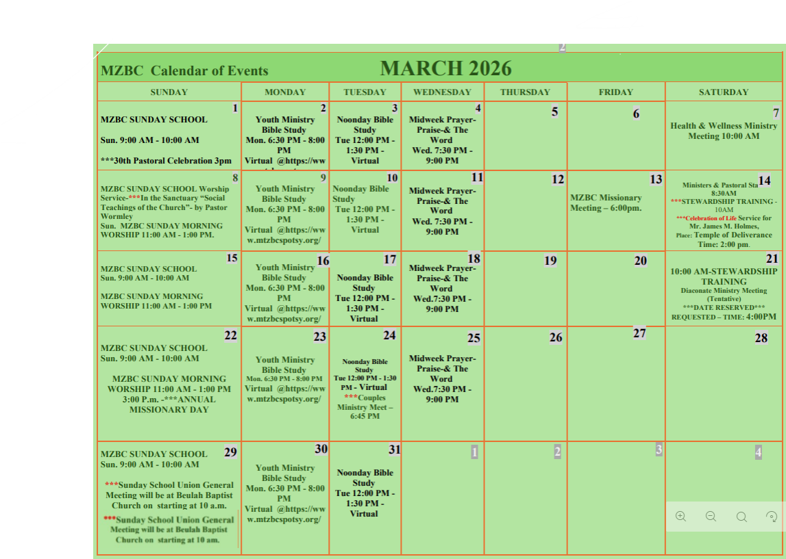 Saturdays at 10:00 a.m. | Led by Rev. Dr. Charles W. Wormley, Pastor | For All MZBC Members