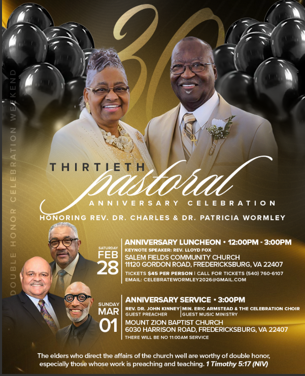 Mount Zion Baptist Church of Spotsylvania joyfully invites our church family and friends to celebrate 30 years of faithful shepherding by Rev. Dr. Charles W. Wormley and First Lady Rev. Dr. Patricia Wormley.
